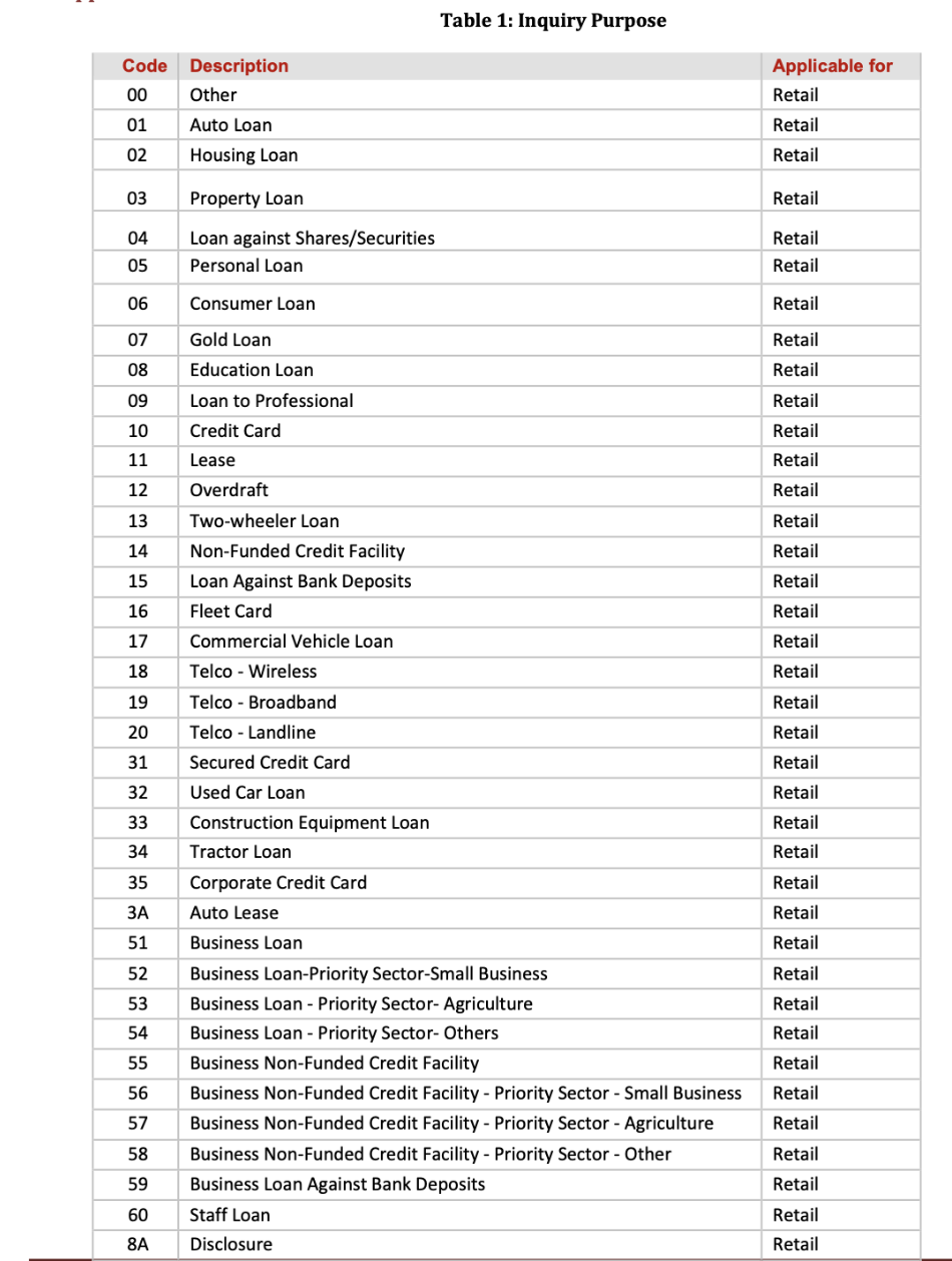 | inquiryPurposeCode | String | Mandatory (M) | Purpose of enquiry |